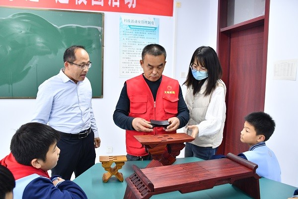 “同学们,你看这是什么呀?大家都不认识吧?这是鲁班凳,它在我们中国已经流传了2600多年,是名副其实的手艺品,制作过程中不用一根钉子、不涂一点胶水,全靠我们古人创造的榫卯结构进行组装……”11月14日,在惠民县麻店镇中学科学实验室内,来自麻店镇刘桥自然村的传统手工艺人刘书德正为孩子们讲解中国古代的传统木工作品。