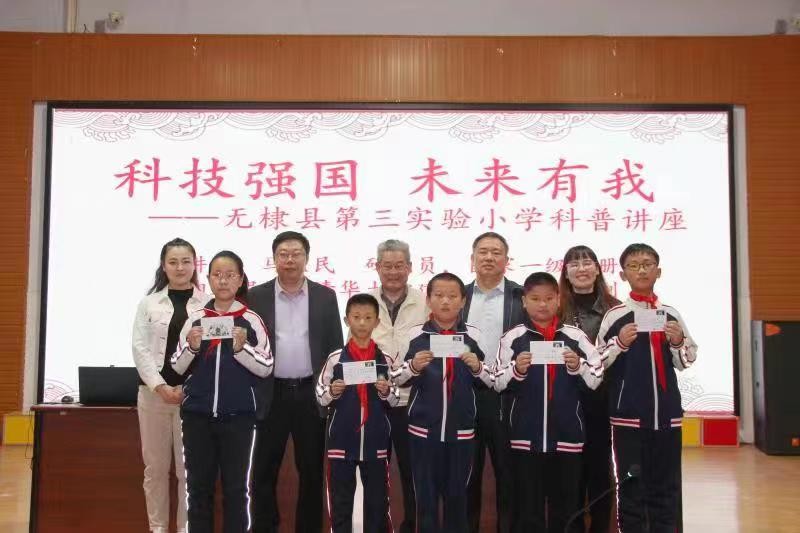 4月18日,清华大学老科协科普演讲团研究员马宝民教授在滨州科技协会、无棣县科技协会领导的陪同下走进无棣县第三实验小学开展科普讲座。