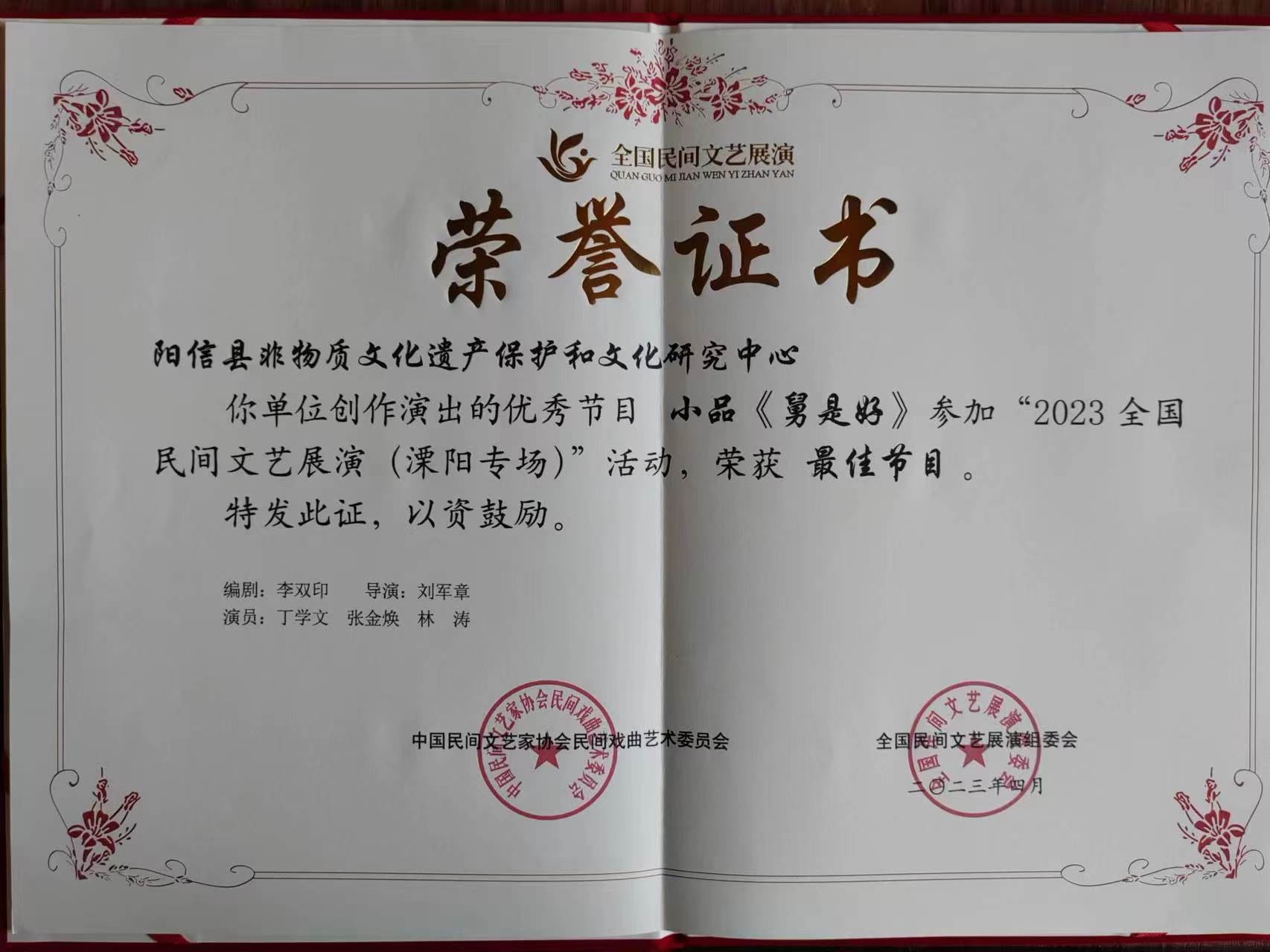 近日,2023全国民间文艺展演在江苏溧阳落下帷幕,阳信县非遗中心推送的小品《舅是好》在展演的38部作品中脱颖而出,获小品类最佳节目。