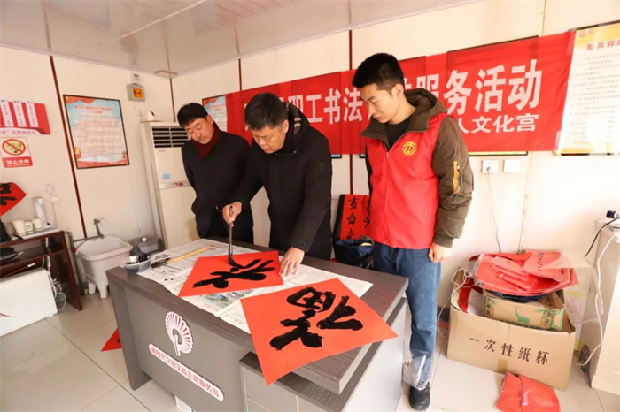 活动现场,锣鼓喧天、气氛热烈,来自县总工会、棣丰街道馨安社区的志愿者们为环卫工、快递小哥等广大户外工作者送去了热腾腾的腊八粥,表达了对户外劳动者的关心与关爱。书法家们挥毫泼墨,书法送“福”,将象征平安和谐、吉祥如意的福字付诸笔端,越于纸上,把红火喜庆的福字发放到户外劳动者手中,祝愿大家的日子越过越红火。