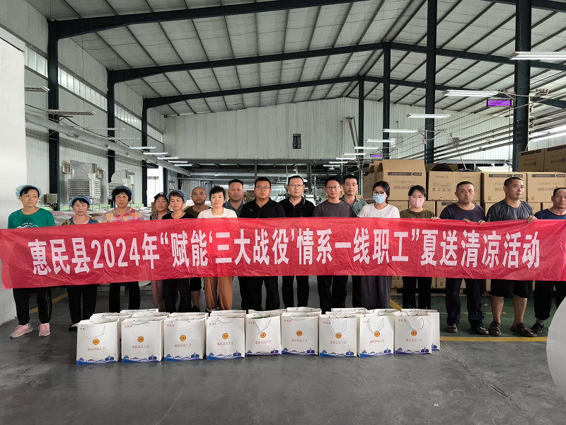 7月29日下午,惠民县总工会党组成员、副主席李龙一行到麻店镇开展“赋能‘三大战役’情系一线职工”夏送清凉活动。在惠民惠达森工贸有限责任公司,李龙一行对坚守岗位的一线劳动者进行慰问,为一线生产工人送上慰问品,把清凉和关爱送到员工手上。
