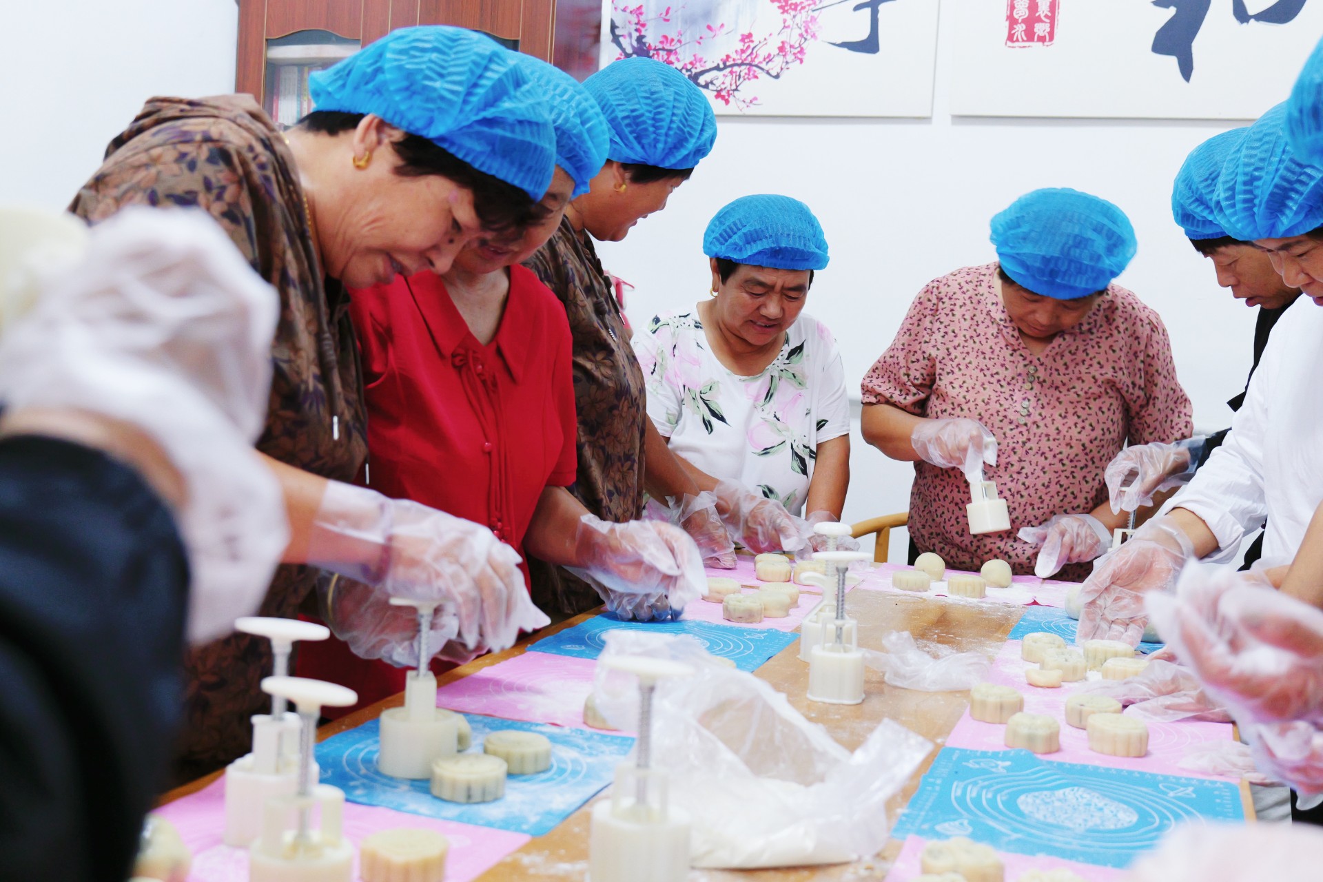 中秋佳节自然离不开月饼。家风畅叙结束后,志愿者拿出面料、各种馅料等事先备置好的制作月饼的材料,指导姐妹们一起制作美味的月饼。和面、捏面、摘面团、压平、包馅、脱模、烘烤、出锅……在志愿者的示范下,整个过程忙而有序。不到50 分钟,一炉又一炉香气扑鼻的月饼新鲜出炉。