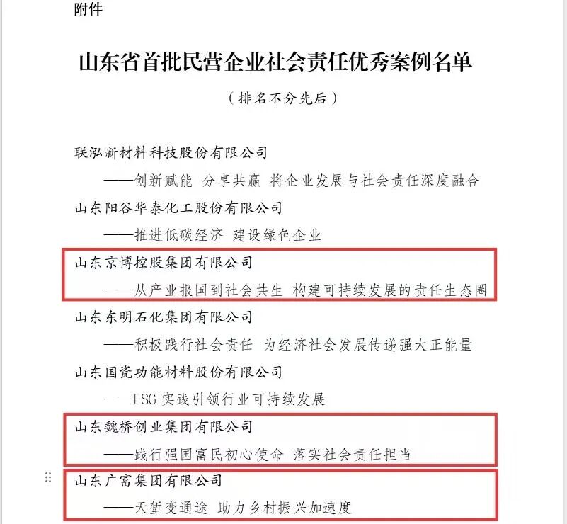 为表彰全省民营企业在履行社会责任方面的突出贡献,近日,省工商联公布了全省首批民营企业社会责任优秀案例,滨州市3个案例入选,分别是:山东魏桥创业集团有限公司——践行强国富民初心使命 落实社会责任担当;山东京博控股集团有限公司——从产业报国到社会共生 构建可持续发展的责任生态圈;山东广富集团有限公司——天堑变通途 助力乡村振兴加速度。