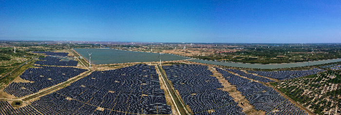 作为滨州首个获批的国家大型光伏基地项目,华能滨州85万千瓦光伏项目每年可发电12.86亿千瓦时。图为华能沾化清风湖200兆瓦风光同场项目(资料图)