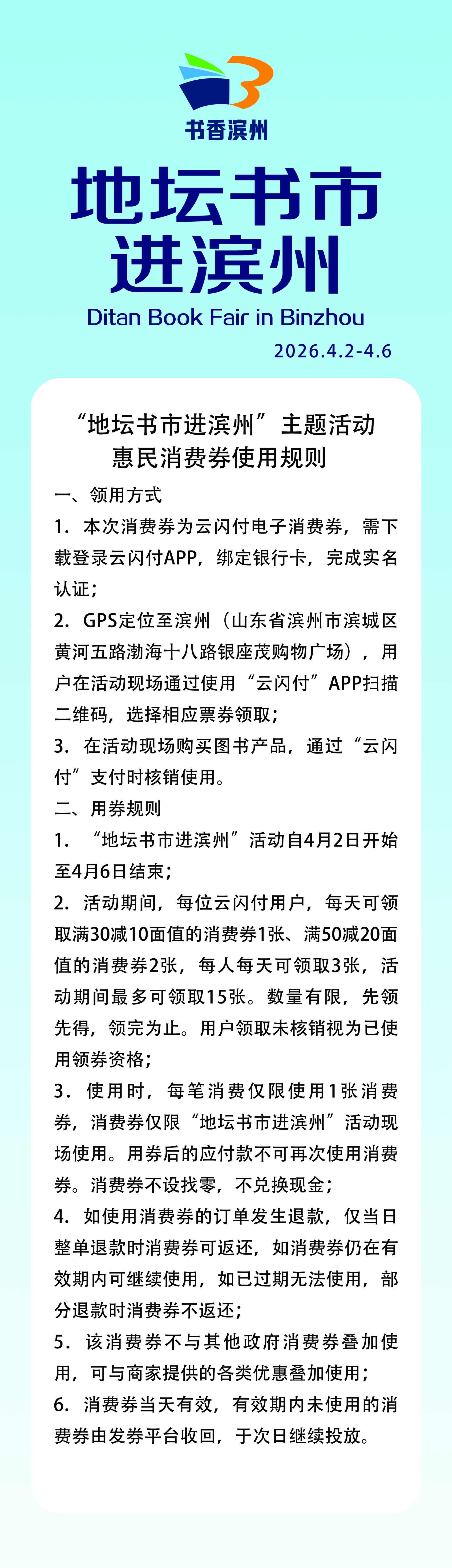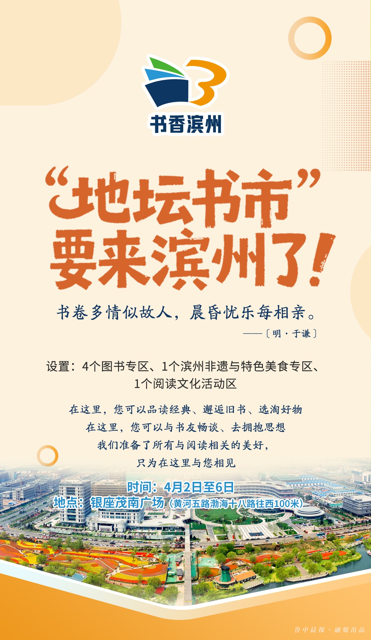 4月2日-6日,由滨州市委宣传部主办的地坛书市进滨州暨"书香滨州·全民阅读"主题活动将在银座茂南广场举办。