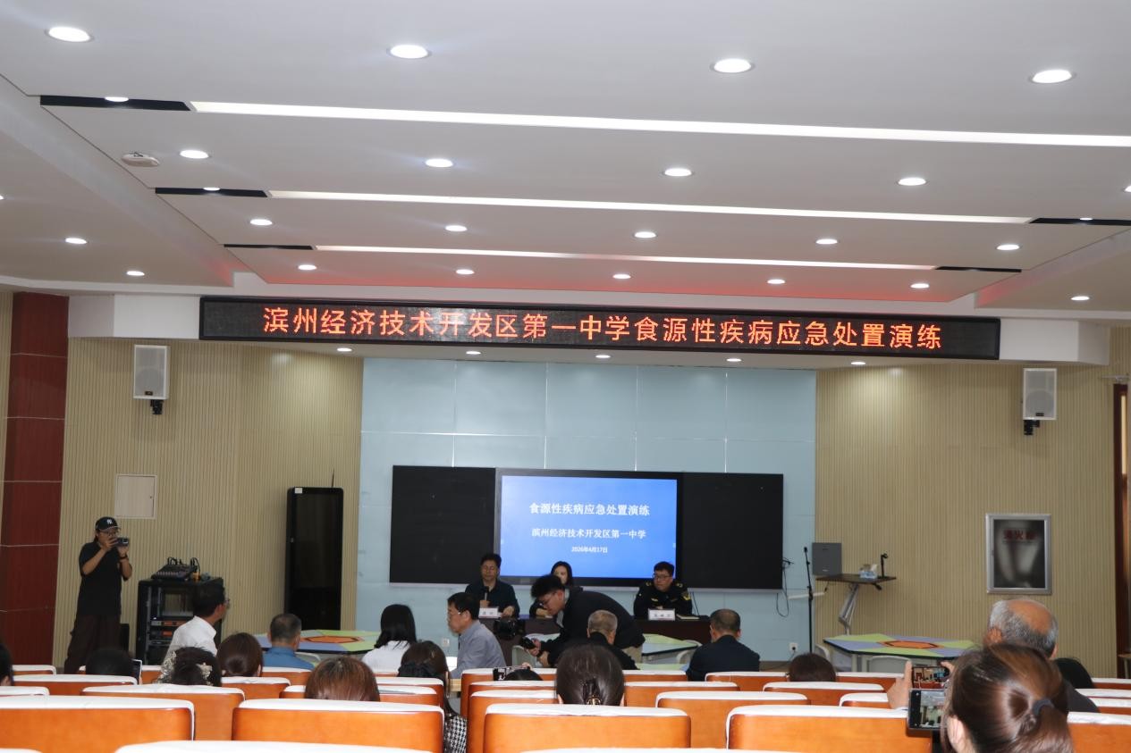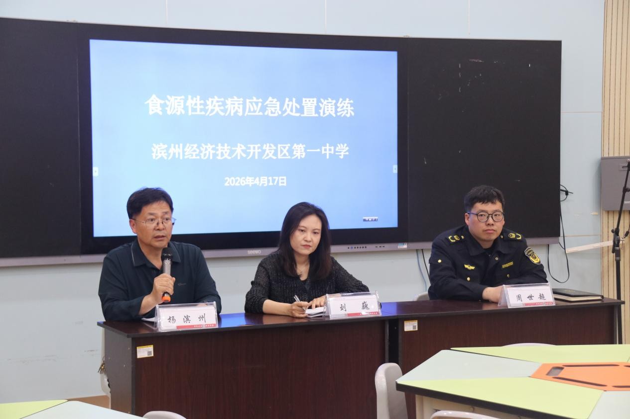 为切实筑牢校园食品安全防线,提升学校应对食源性疾病突发事件的快速反应、协同处置与规范救治能力,4月17日下午,滨州经济技术开发区第一中学开展食源性疾病应急处置实战演练。校长王伟担任演练总指挥,副校长杨滨州担任副总指挥,相关部门负责人及教职工、学生代表全程参与,开发区卫健中心、市场监管局、宣传教育局相关领导到场指导。