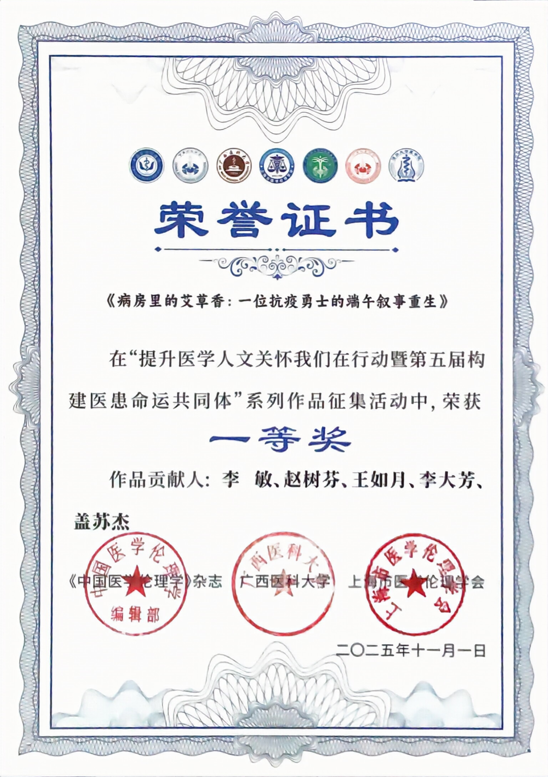 近日,在广西南宁召开的“提升医学人文关怀我们在行动暨第五届构建医患命运共同体”学术大会上,滨州市人民医院护理心理组赵树芬团队凭借叙事护理作品《病房里的艾草香:一名抗疫勇士的端午叙事重生》,从全国820篇案例中脱颖而出,荣获首届“中国医患关系案例大赛”一等奖。