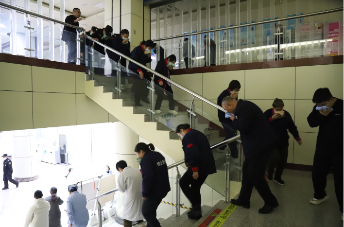 培训结束后,应急疏散演练同步启动。模拟火灾警报声响起后,各应急小组迅速响应,按照预定疏散方案,引导患者及家属用湿毛巾捂住口鼻、弯腰低姿,沿安全通道快速有序撤离至指定安全区域。整个演练过程紧张有序、分工明确,充分检验了医院应急预案的科学性和可操作性,达到预期培训效果。
