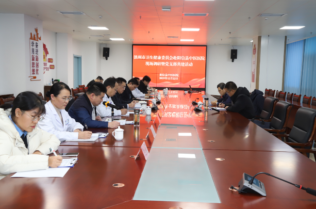 近日,滨州市卫生健康委员会党组成员、副主任,市疾控局局长吕兴博,市卫生健康委中医药综合科科长杨圣君一行,到阳信县中医医院开展现场调研及党支部共建活动。阳信县卫生健康局党组书记、局长,县中医药管理局局长张勇,县中医药科科长王斌,阳信县卫生健康局党组成员、县中医医院党委书记马清华及院领导班子成员陪同调研并参加座谈。