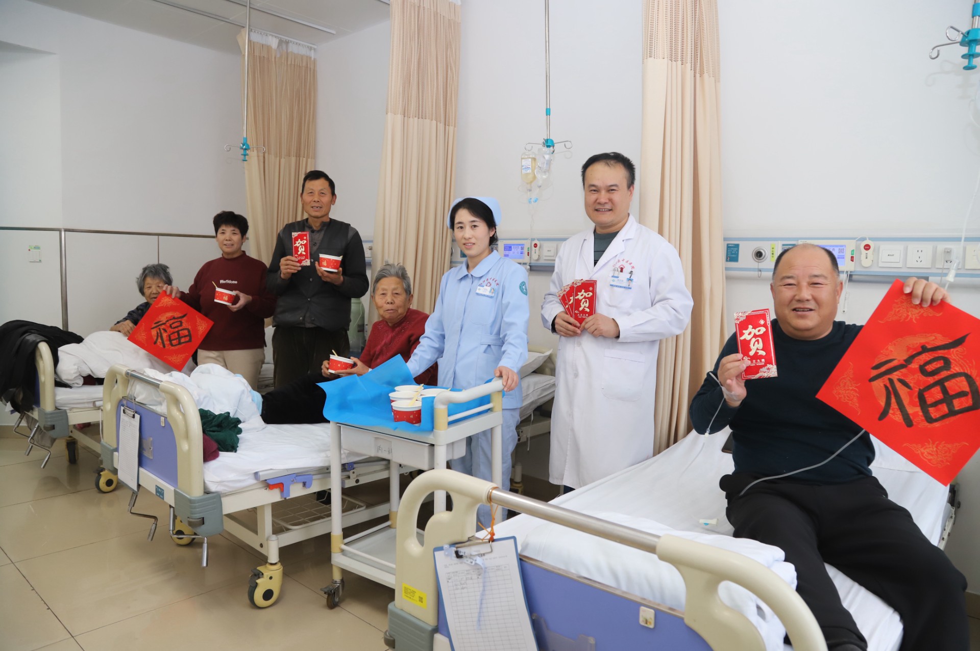 同时,医护人员精心煮制汤圆、准备茶点,带着亲笔书写的福字,走进每一间病房,为患者送上节日的祝福与问候。热气腾腾的汤圆、饱含心意的福字、贴心细致的服务,让整个病区洋溢着喜庆祥和、其乐融融的节日气氛,也让患者及家属倍感温暖与舒心。
