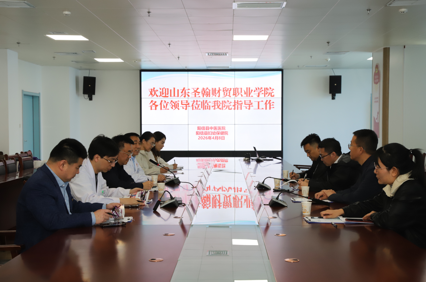 2026年4月8日,山东圣翰财贸职业学院食品药品与医学技术学院院长杨其义一行4人到阳信县中医医院,就实习基地对接工作进行现场考察。院党委书记马清华,党委副书记劳万升等科室负责人热情接待并陪同。