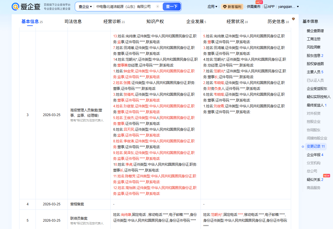 据爱企查,3月25日,中电鲁北清洁能源(山东)有限公司投资人、负责人等发生变更。