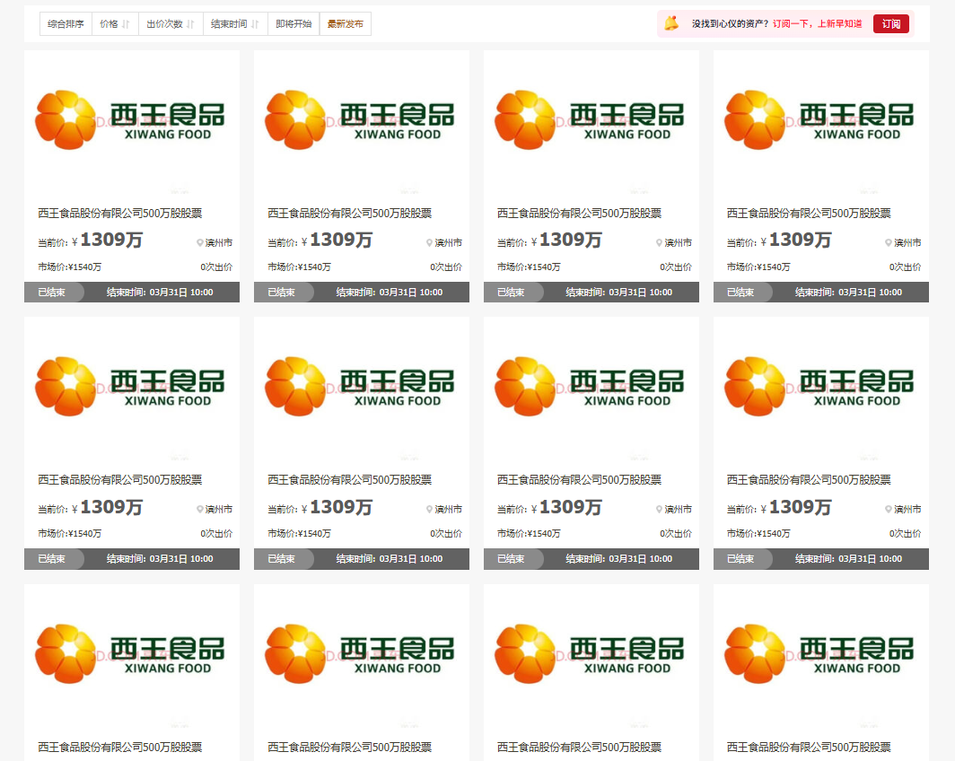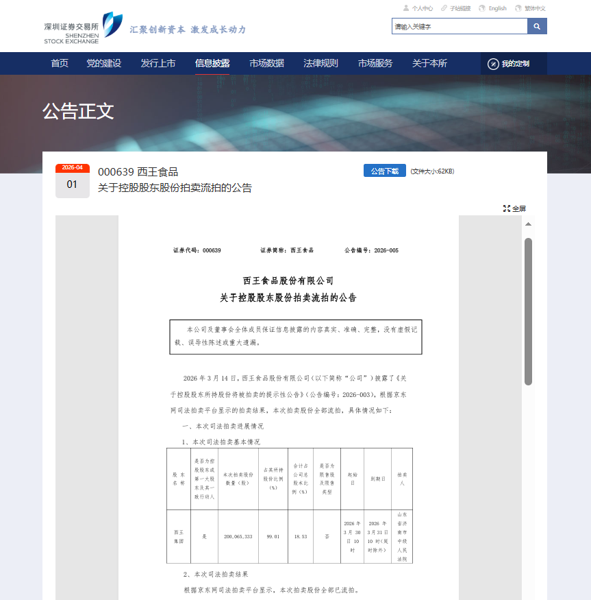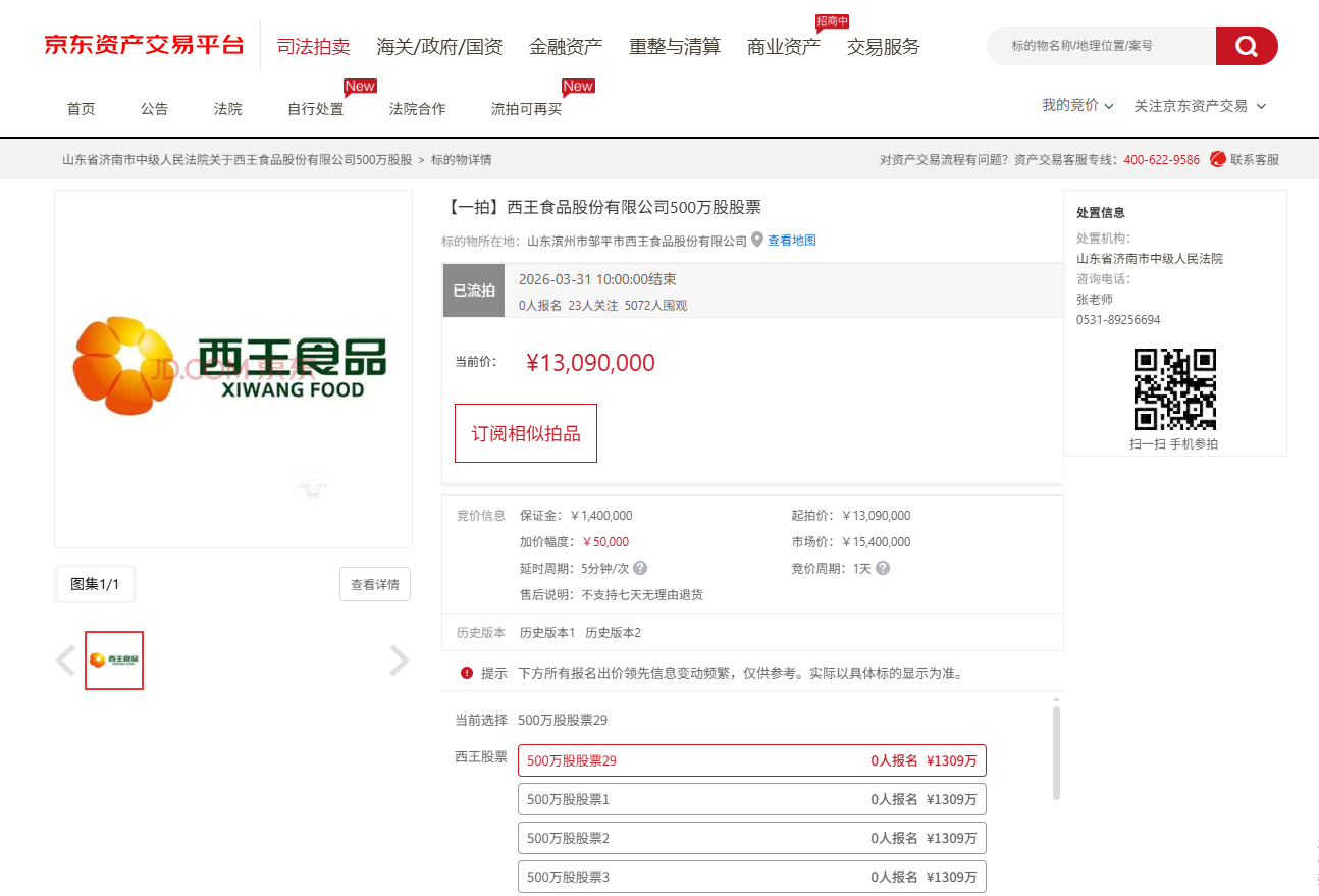 3月31日,西王食品股份有限公司(以下简称“西王食品”)控股股东西王集团有限公司(以下简称“西王集团”)持有的超2亿股公司股票在京东网司法拍卖平台公开竞价,因24小时内无人报名,最终流拍。