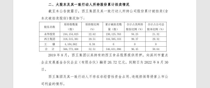 早在3月13日,深圳证券交易所网站就发布了《西王食品股份有限公司关于控股股东所持股份将被拍卖的提示性公告》,西王食品控股股东西王集团持有的超2亿股公司股票在京东网司法拍卖平台(https://www.jd.com)进行公开拍卖。若本次股份拍卖完成,或可能导致公司控股股东、实际控制人发生变更。公告显示,2019 年8月,西王集团以其持有的西王食品股票提供质押,向滨州市重点企业发展基金合伙企业(有限合伙)融资20.72亿元,到期日为2022年8月30日。截至本公告披露日,西王集团及其一致行动人所持公司股份累计多次被拍卖。