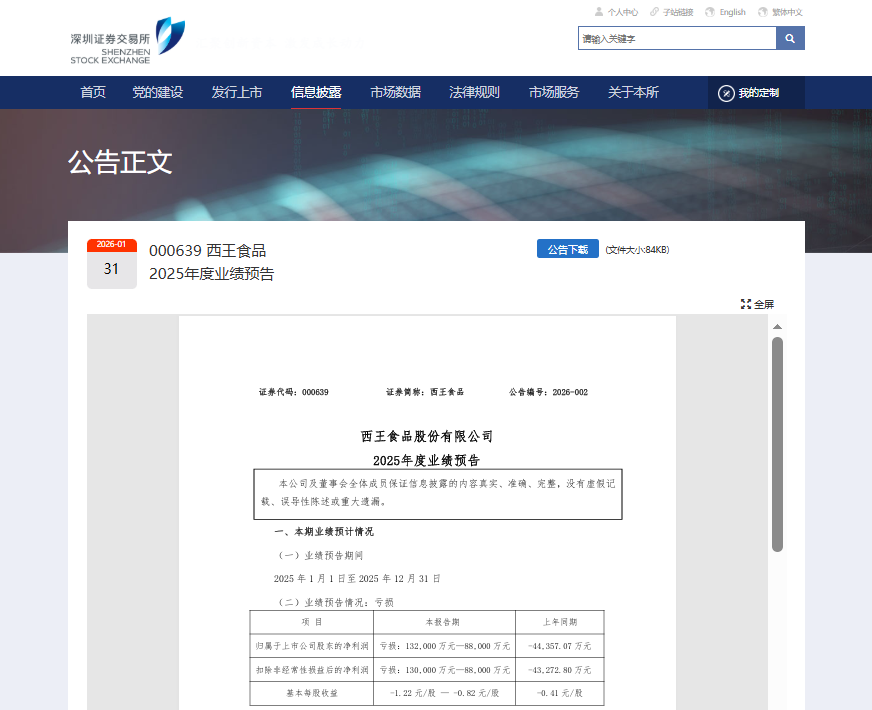 另外,据深圳证券交易所网站发布的《西王食品股份有限公司2025年度业绩预告》,2025 年1月1日至12月31日西王食品的业绩预告情况为亏损。公告对于业绩亏损预告解释称原材料乳清蛋白的价格不断上涨以及日益加剧的竞争压力,导致运动营养板块业绩不及预期。