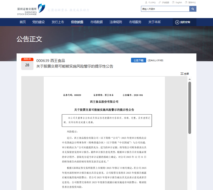 3月27日,《西王食品股份有限公司关于股票交易可能被实施风险警示的提示性公告》又称,近日,西王食品股份有限公司(以下简称“公司”)2025年度审计机构北京中名国成会计师事务所(特殊普通合伙)(以下简称“中名国成”)与公司沟通,审计机构认为“公司未能提供充分、适当的审计证据,将导致公司财务报表出具非无保留意见的审计报告,最终审计报告意见类型,根据审计报告日在实施必要的审计程序、获取充分适当审计证据的基础上确定;对公司2025年12月31日的财务报告内部控制有效性发表否定意见。”