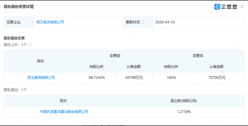 据企查查,近日,西王集团有限公司(以下简称“西王集团”)在西王物流有限公司(以下简称“西王物流”)的持股比例由98.72%上升至100%,中国农发重点建设基金有限公司(以下简称“农发基金公司”)正式退出,西王物流自此由西王集团全资控股。