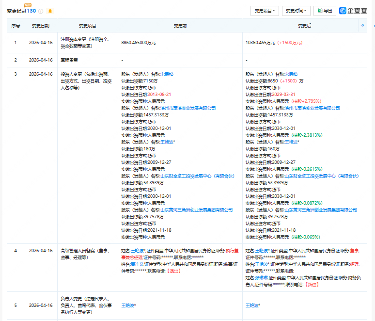 在股东信息方面,第一大股东宋民松认缴出资额增加1500万元,持股比例为83.49%,滨州市惠滨实业持股比例为14.07%,王艳波持股比例为1.54%,山东财金卓工投资发展中心(有限合伙)持股比例为0.52%,山东黄河三角洲创业发展集团有限公司持股比例为0.38%。