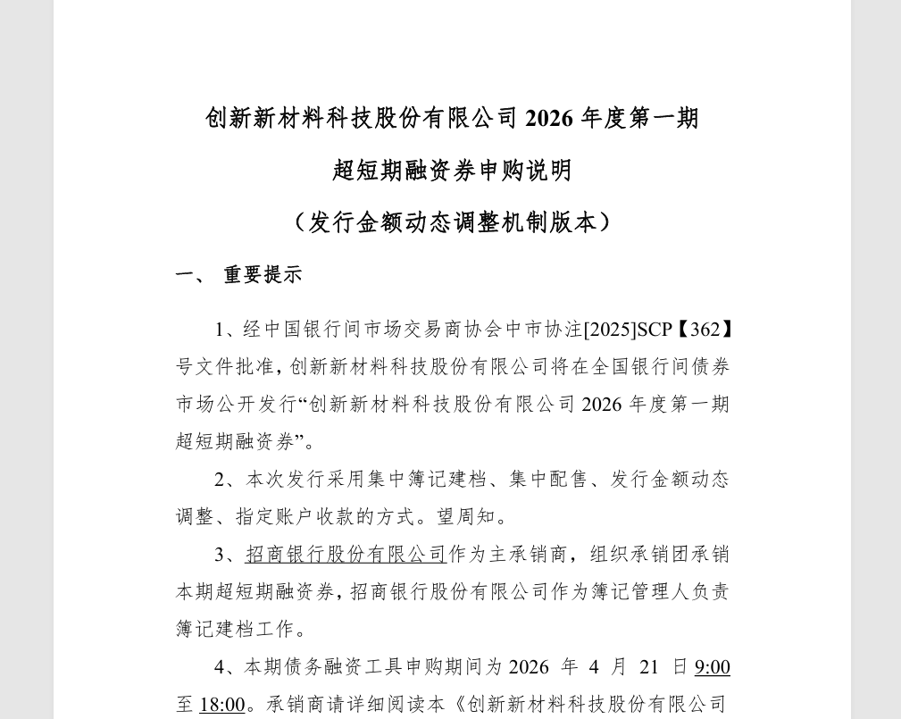 4月20日,中国外汇交易中心发布《创新新材料科技股份有限公司2026 年度第一期超短期融资券申购说明(发行金额动态调整机制版本)》称,创新新材料科技股份有限公司(以下简称“创新新材”)将在全国银行间债券市场公开发行“创新新材料科技股份有限公司2026年度第一期超短期融资券”,本期债务融资工具的基础发行规模为人民币3亿元,发行金额上限为人民币5亿元,期限为180日。
